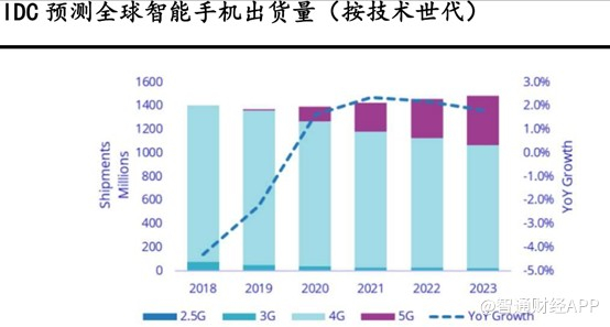 据IDC预测,2020年全球智能手机出货量有望复苏,而5G手机成为主要带动因素,从4G手机渗透速度看,国内从2014年初开始至2016年底达到高峰,将近三年。若从2019年算起,5G手机在2020年和2021年两年内加快渗透。