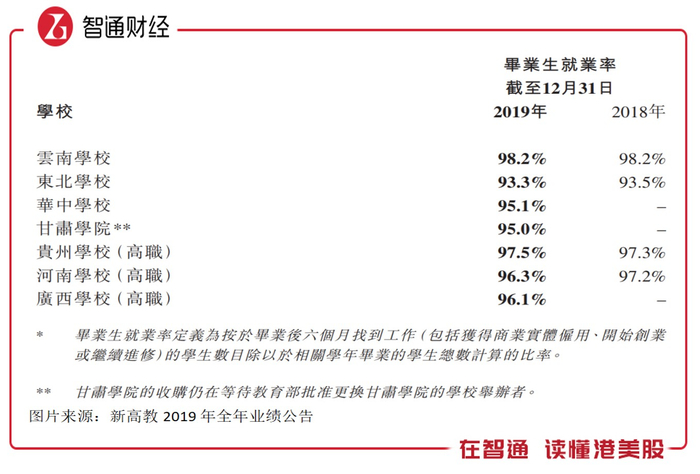 2019年,新高教的7所学校平均就业率达97.35%,远高于行业水平,其中高品质(主要为毕业生就业于世界500强、中国企业500强以及上市公司)就业率达38.48%,其中云南学校往年的就业率水平均达到98%以上,在港股上市公司中,处于领先水平。