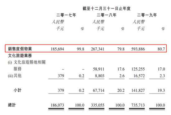 2017年至2019年期间,中国文旅分别收入1.86亿元、3.35亿元、7.36亿元,其中销售度假物业的营收比例较大,期内占比为99.8%、79.8%、80.7%。