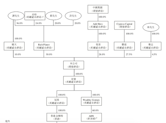 股权结构里,谭嘉伟持股10%,陈凯君旗下卓时持股24%,蔡宏江持股20%,许清彬持股20%,这一边基本以原始投资者为主。另一边,奥园透过悦景持股28%、赵文玮透过Cypress Capital旗下骐达持股27.5%,林锦堂持股4.5%。