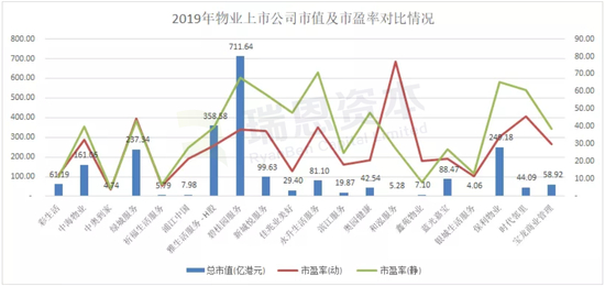 截止至2019年12月31日,静态市盈率排名前三的是永升生活服务(70.88倍)、碧桂园服务(67.7倍)和保利物业(65.16倍)。至2019年12月31日前上市的20家物业管理公司平均静态市盈率为 36.51 倍。2020年新上市的兴业物联(09916.HK)和烨星控股(01941.HK)未列在内对比,不过截至4月20日收盘,他们的市盈率分别为12.2倍、14.9倍。