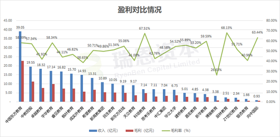 毛利排名前三甲的企业分别是中国东方教育(22.80亿元,毛利率58.4%)、中教控股(11.21亿元,毛利率57.3%)和宇华教育(10.00亿元,毛利率58.3%)。