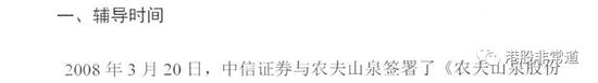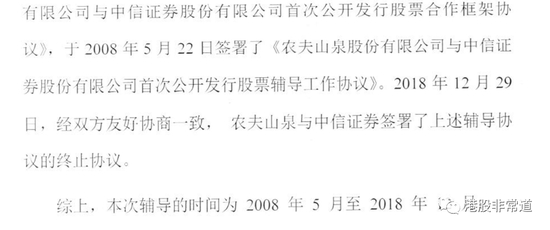 根据2019年1月12日,中国证监会浙江监管局发布的文件显示,在2008年3月20日,中信证券就与农夫山泉签署了《农夫山泉股份有限公司与中信证券股份有限公司首次公开发行股票合作框架协议》,并在当年5月22日签署了上市辅导工作协议。但在2018年12月,双方协商后,终止了这一上市辅导,不禁令人唏嘘。