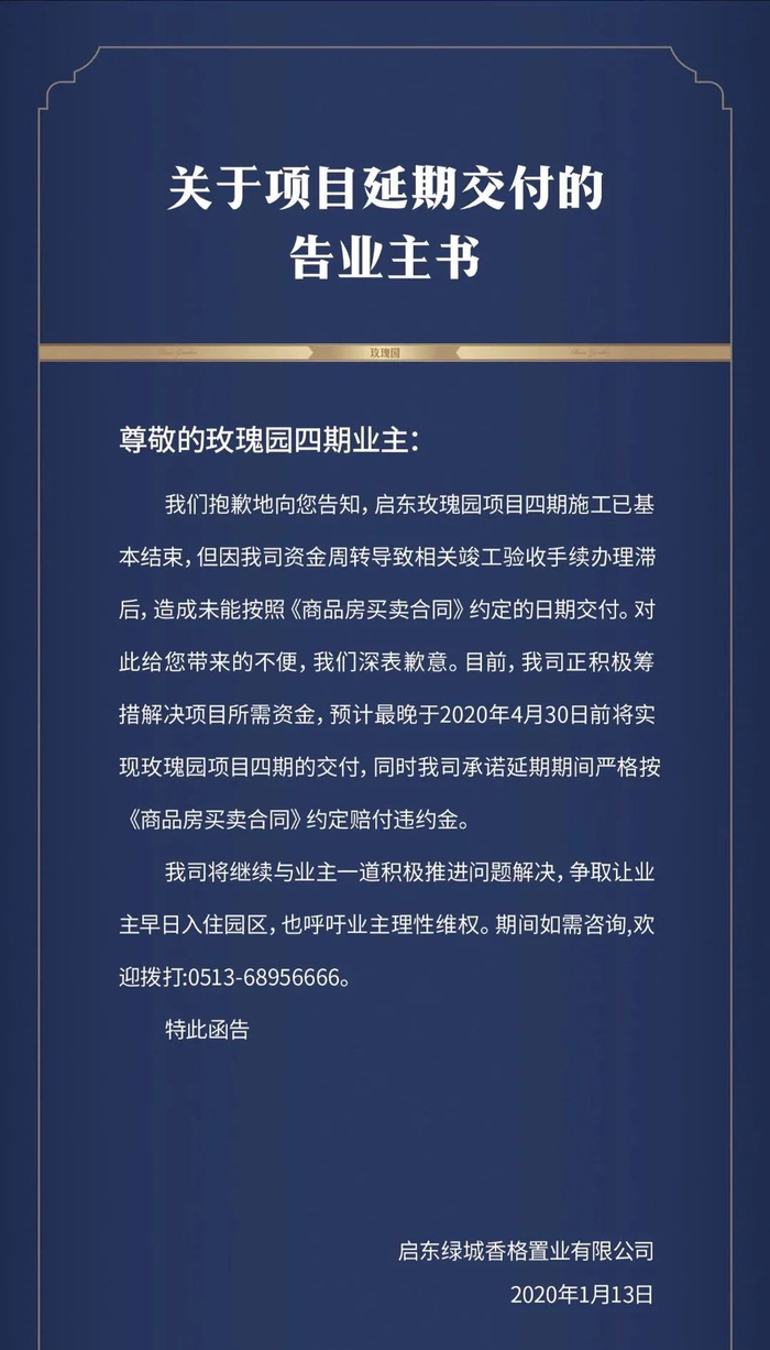 业主们便通过多种途径进行维权。至今年1月13日,绿城香格发布《关于项目延期交付的告业主书》,绿城香格称,启东玫瑰园项目四期施工已基本结束,但因公司资金周转导致相关竣工验收手续办理滞后,未能如期交付。公司正积极筹措解决项目所需资金,预计最晚于2020年4月30日前实现交付。
