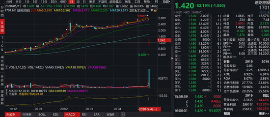途屹控股昨日暴跌66.7%开盘,盘初便继续跳水暴跌逾80%,低见0.4港元,30亿市值蒸发到只剩4亿,大股东虞丁心个人持股4.6875亿股,个人身家直接蒸发掉12.19亿,而当时持股市值只剩1.875亿,近15亿持股只剩不到2亿,不免让人唏嘘。不过,公司股价最后拉升到了1.42港元,如果从低点0.4港元计算,股价暴涨了355%。