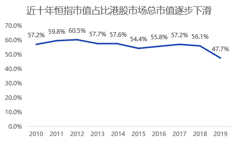 恒指作为香港市场最老牌的指数,固然有其历史时间久、影响力强等特点,但在新经济蓬勃发展、内地公司香港上市越来越多的背景下,原有的纳入规则已经略显陈旧,对香港整体市场的代表性在下降。