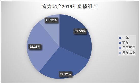 根据富力2019年,财报数据显示,在所有的负债中,富力地产需在一年内、两年、三至五年以及五年以上偿还的债务为622.71亿元、576.07亿元、557.44亿元、215.19亿元,分别占总负债的31.59%、29.22%、28.28%以及10.92%。