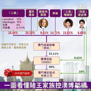 日前签署协议的二房、霍氏联盟持有逾53%澳娱股份,澳娱又持有54%澳博控股,澳博控股持有90%澳博股权,层层垂直控股下,联盟即间接拥有坐拥赌牌的澳博“话事权”。