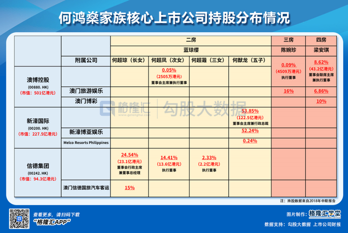 此外,二房蓝琼缨还持有澳娱母公司Lanceford公司49.45%的股份,而Lanceford持有澳博控股55.7%股份,蓝琼缨间接持有澳博控股6.42%的股份。2018年4月,何超凤接替何鸿燊担任澳博主席和执行董事。