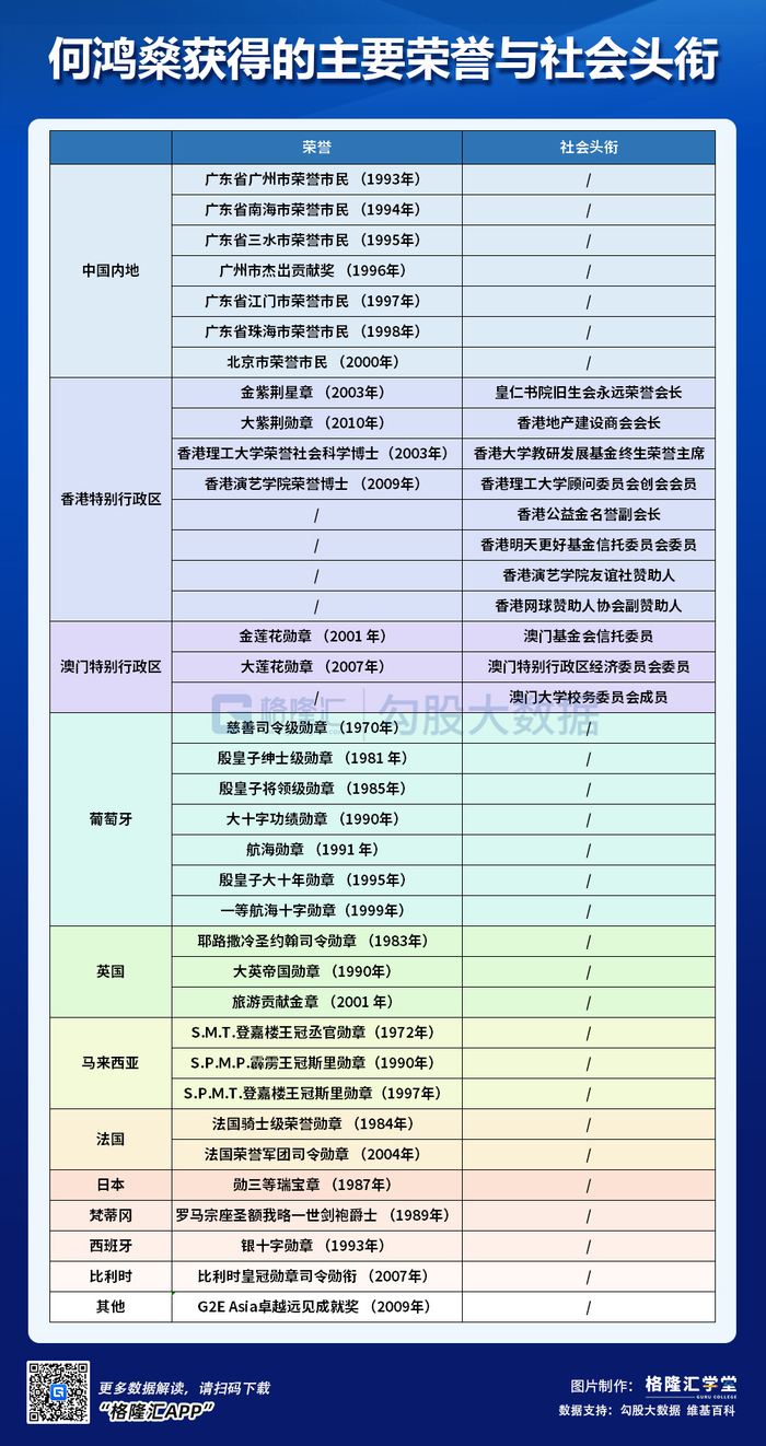 何鸿燊一生,在中国、葡萄牙、英国、马来西亚、法国等国家和地区获得荣誉头衔数不胜数。