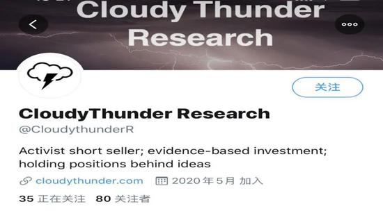 尽管阴霆研究5月26日在Twitter发文预告,并@一众知名做空机构和空头,但是只有GMT Research、JCap Research(美奇金)、Breakout POINT和Hindenburg Research回粉关注了阴霆研究,但上述机构只有GMT和美奇金有做空中概股的经历,而其他被阴霆研究@的知名做空机构,如浑水、杀人鲸、wolfpack等,并没有关注该机构。
