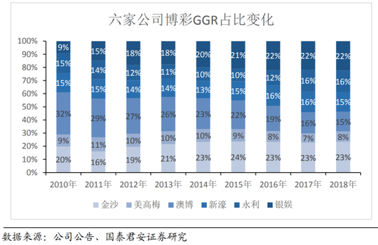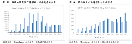 截止2018年底,澳博所有已建成物业全部分布在半岛,半岛营收占比为100%,银娱在半岛和路氹两地双栖发展, 路氹物业营收占比超过70%相对来讲,银娱的选址战略更符合澳门整个的发展逻辑,因而能够超越澳博后来居上,充分享受到澳门博彩业发展的红利。