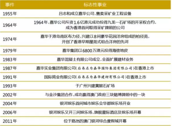 1955年,嘉华公司应运而生(表1)。吕志和不仅借此赚取到第一桶金,还结识了霍英东等一帮富豪好友。霍英东在经营从事建筑、船务及海沙生意的有荣公司期间,就曾向吕志和购入机械。