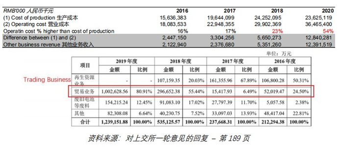 天能在回应中提到其“根据行业惯例,存货周转率按照营业成本除以平均存货余额计算”。事实上天能的营业成本比生产成本高出54%。之前的差额主要是其他非主营业务构成的,里面最大一部分是贸易业务。换句话说,天能通过数额巨大的贸易业务稀释其库存周转天数。