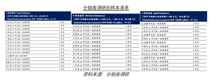 我们广泛的调研表明,公司的陈述并不符合实际情况。我们对天能在全国的40家分销商进行了深入调研(“分销商调研”)。我们分销商调研的样本包括来自全国多个省区的13家小型分销商,12家中型分销商和15家大型分销商。令人震惊的是,我们从所有这三组收集到的数据都与公司披露的数据严重不符,也就是说,这些分销商报告了明显长于公司披露的返利周期。