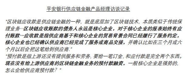 从浙商银行官网中我们也可以看到,其区块链金融业务是基于企业应收款,也就是对约定产品或服务已经发生并完成的交易。并没有基于预付账款的区块链业务。
