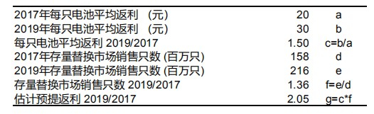 因此,对存量替换市场中售出的每只电池,公司在2019年应确认的每只的返利比2017年增加50%(从2017年的人民币20元增加到2019年的人民币30元)。根据公司披露的数据,2019年的存量替换市场的销售数量比2017年增长36%。即使不延长返利周期,我们计算到2019年底公司的预提返利也应为2017年的两倍。