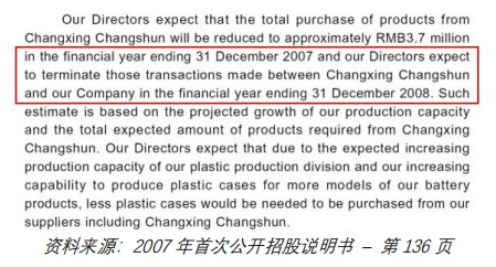 天能动力在其2007年IPO招股说明书中告诉投资者,由于内部产能的增长,他们将终止与长兴长顺的交易。这是另一个公然的谎言。在最近的四年里,我们依然看到了这些交易。天能动力所做的就是重组股权安排,以避免在香港的公开文件中进行关连交易的披露。