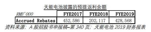 公司在对上交所一轮问询的回复中披露了2016年至2019年平均每只电池的出厂价,平均返利和实际结算价。根据以下披露,2017年,电池平均出厂价为人民币140元,确认人民币120元的净收入,并计入人民币20元的预提返利。到了2019年,平均每只电池的出厂价为人民币139元,确认人民币110元的净收入,并计入人民币30元的预提返利。