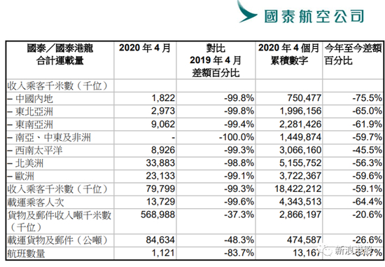 5月中旬,国泰航空(00293)公布国泰航空与国泰港龙航空于4月份合并结算的客运量,两航空公司在4月份合计载客13729人次,同比下跌99.6%。前四个月载客人次较去年同期下跌64.4%。