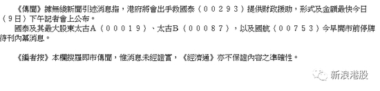 不过,另有传闻指出,香港特区政府将会出手救国泰航空提供财政援助,具体形式和金额将于下午记者会公布。
