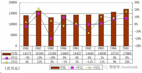 网易2017-2019年,净收入分别为444.37亿元、511.79亿元、592.41亿元。2020年第一季度,净收入为170.62亿元,同比增长18.3%。