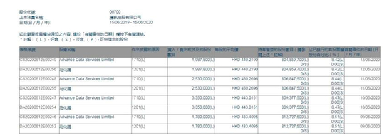 2020.6.9-6.12:马化腾持股比例降至8.42%;套现42.87亿港元。