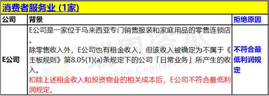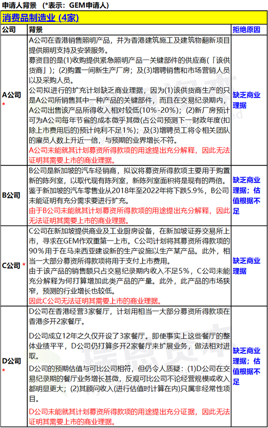 联交所于2020年6月公布了《就联交所为何拒绝若干上市申请提供指引(2020年6月)》,主要列出了2019年被联交所拒绝上市申请的18宗(其中主板12宗、GEM6宗)上市申请的案例,包括消费品制造业 (4)、消费者服务业 (1家)、工业 (5家)、地产建筑业 (8家)。具体如下: