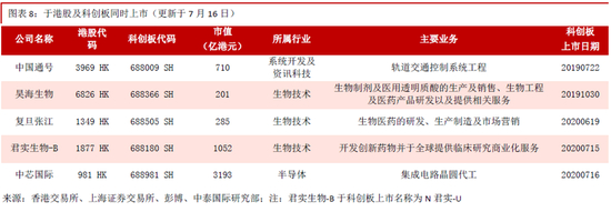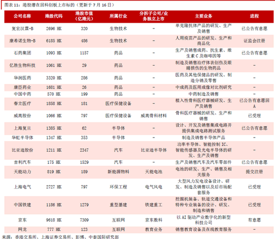 我们通过整理列出了港股潜在回科创板上市的清单:复宏汉霖-B(2696 HK)、康希诺生物-B(6185 HK)、石药集团(1093 HK)、亿胜生物科技(1061 HK)、华润医药(3320 HK)、康臣药业(1681 HK)、中国中药(570 HK)、春立医疗(1858 HK)、威高股份(1066 HK)的威高骨科材料、上海复旦(1385 HK)、华虹半导体(1347 HK)、比亚迪股份(1211 HK)的比亚迪半导体、吉利汽车(175 HK)、天能动力(819 HK)的天能电池、上海电气(2727 HK)的电气风电、中国铁建(1186 HK)的铁建重工、京东(9618 HK)的京东数科、网龙(777 HK)的教育业务。