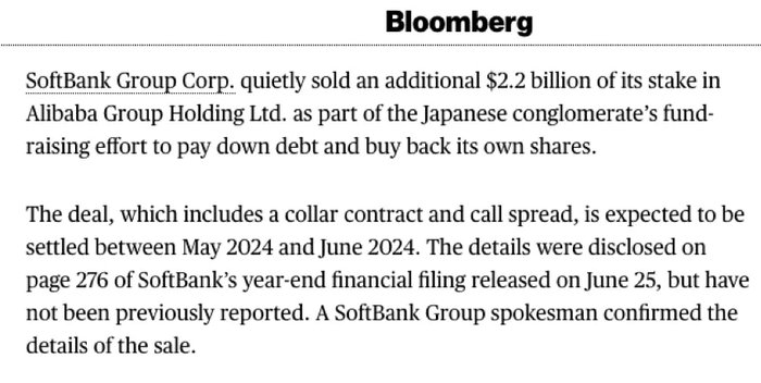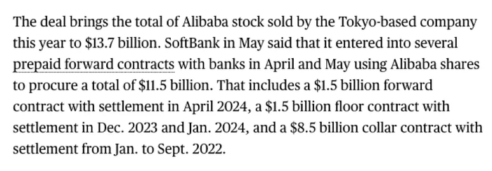 据报道,软银集团近日又悄然抛售了价值22亿美元的阿里巴巴股份。该笔交易包含了一个领子期权合约(collar contract)和看涨期权价差(call spread),预计于2024年5月至2024年6月间结算。