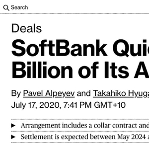 第三,软银的这次减持是否在公开市场进行还不得而知。由于我没有找到具体的披露,交易细节不得而知。但是根据“该交易包含领子期权合约”以及“2024年交割”这样的字句,可以猜测这笔交易会和2016年减持时类似,即采用预付远期合约来进行。那么,很可能又会采用信托为交易对象,不在二级市场出售,而股票的交割更得到2024年进行。具体出售的股票数量将用交易金额除以交割日的股票价格确定,因此软银要用领子期权合约作对冲。