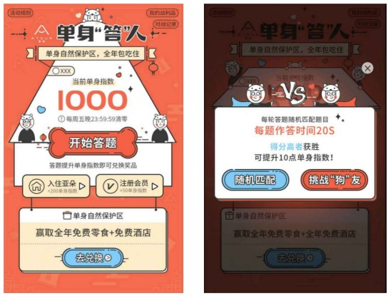 兑吧为亚朵定制的“单身达人”活动,以关爱单身人群为噱头,进行用户匹配答题PK,并设置不同程度奖品兑换门槛及兑换周期,吸引用户频繁参与。据统计,本活动平均参与率达80%,复参8次,分享率50%,分享页人均打开次数近3次,分享成功邀请好友平均参与率达40%。