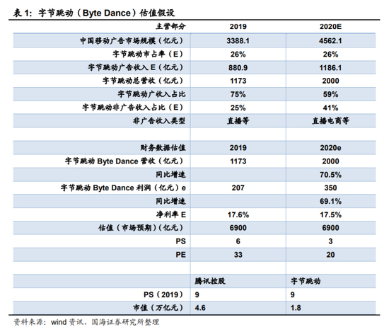 国海证券表示,2019 年字节跳动的核心收入来自广告,预计 2020年公司收入将达到 2000亿元,我们通过移动广告市场规模以及公司占比,也倒推算出其收入的合理性, 目前的估值主要基于现有主业,不包括其直播电商业务、各细分内容市场业务、 B 端企业级服务业务等。目前市场的估值也是基于新进入字节跳动的投资者后 的合理假设估值,我们认为,基于主业的广告营销收入,从PS或者PE角度看, 字节跳动的估值,仍有较大提升空间。若对比腾讯控股(0700)2019 年PS为9倍,字节跳动2020年若在2000亿元收入指引下的市值约为1.8万亿元(小浪注:折合2576亿美元)。(文/金石)