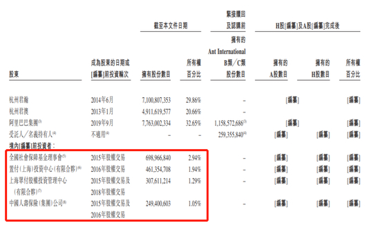 不计阿里及蚂蚁集团员工持股,境内投资者则以全国社会保障基金理事会(社保基金)拥有最多股份,2015年入股,上市前股权比例为2.94%,涉及6.99亿股份,中国人寿持有2.49亿股,持股1.05%。