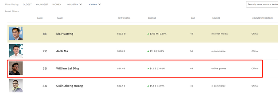 最新招股资料显示,丁磊持股14.56亿股,持股占比44.7%,按港股价格统计的总市值计算,丁磊持股市值为2528.76亿港元,折合326.29亿美元。根据福布斯实时数据,丁磊身家为313亿美元,跻身中国第三大富豪,仅次于马化腾、马云。其中,马化腾身家突破600亿美元,最新为609亿美元,马云身家518亿美元,蚂蚁上市在即阿里近期不断上涨。超过300亿美元的还有拼多多董事局主席黄峥和恒大集团董事局主席许家印。