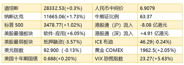 1、隔夜美股截至收盘,道指涨0.3%,报28332.53点,纳指涨1.73%,报11665.06点,标普500指数涨1.02%,报3478.77点。港股ADR指数全日偏软,按比例计算,收报25427点,跌63.70点或0.25%。
