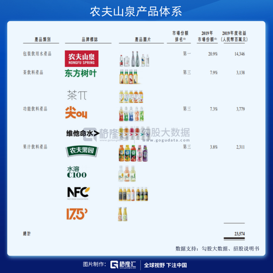 农夫山泉的研究团队也挺争气,根据农夫山泉的招股书中提供的数据,2019年,农夫山泉瓶装水的市占率是第1,茶饮、功能性饮料和果汁的市占率都是第3。
