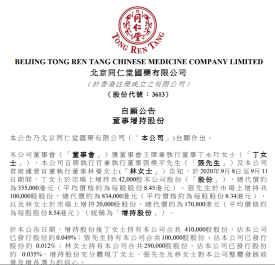 9月14日消息,同仁堂国药发布消息,本公司董事会获董事会主席兼执行董事丁永玲女士、本公司首席执行官兼执行董事张焕平先生及本公司首席运营官兼执行董事林曼女士告知,于2020年9月8日至9月11日期间,丁女士于市场上增持共42000股本公司股份,总代价约为355000港元,张先生于市场上增持共100000股股份,总代价约为834000港元,以及林女士于市场上增持20000股股份,总代价约为170,800港元。