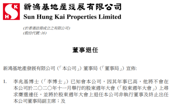 新鸿基地产发展有限公司(新鸿基地产,0016.HK)发布公告称,李兆基因年事已高,将不在公司于2020年11月举行的股东周年大会上寻求膺选连任,并将于股东周年大会上退任公司非执行董事及终止出任公司董事局副主席。