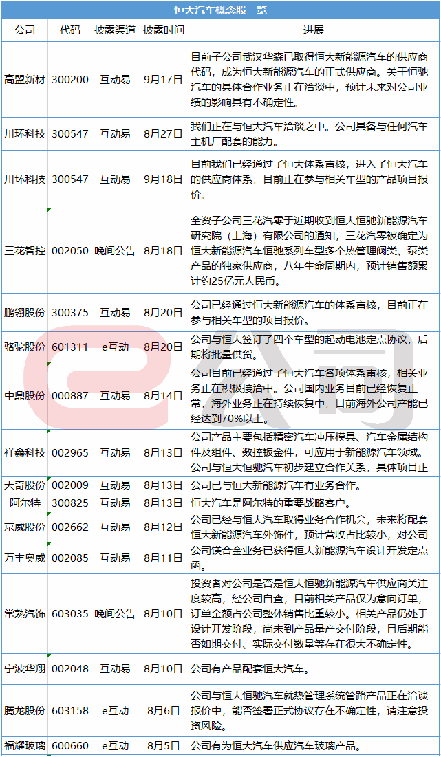 在A股,恒大汽车已经有不少产业链上的小伙伴。