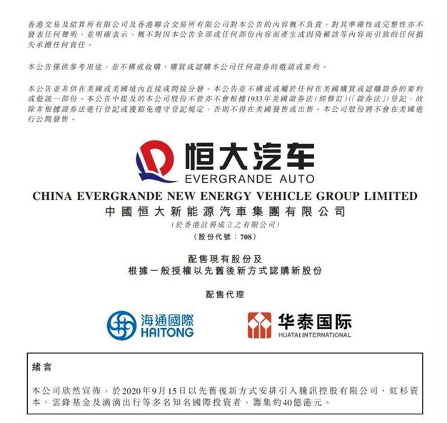 稍早之前的9月15日,恒大汽车公告,通过配售新股募资40亿港元,并在短时间内获得大幅超额认购。恒大汽车此次引入的投资者包括腾讯、滴滴等互联网巨头,以及云锋基金、红杉资本等国际顶级投资基金。