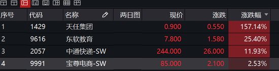 中通快递、宝尊电商、天任集团、东软教育科技今日挂牌上市。今日开盘,中通快递涨11.93%,一手赚1300港元,总市值2070亿港元;宝尊电商涨2.5%,总市值206亿港元;天任集团暴涨157%,现报0.9港元,一手赚4400港元;东软教育涨25.4%,报价7.8港元,一手赚1264港元。