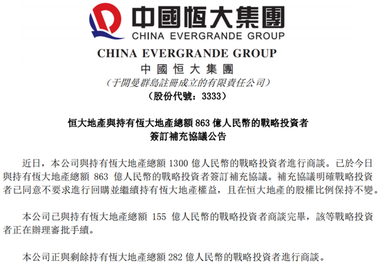 9月29日晚间,中国恒大(3333. HK)公告称,其与持有恒大地产总额1300亿元战投中的863亿元战投资金方签订补充协议,战投同意不进行回购,继续持有恒大地产权益,且股权比例保持不变。
