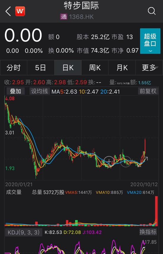 10月9日,特步国际公告披露,特步品牌形象代言人谢霆锋同意认购特步国际500万股股份。10月12日,特步国际股价高开高走,收盘大涨17.53%,收于2.95港元,创近半年以来的新高。