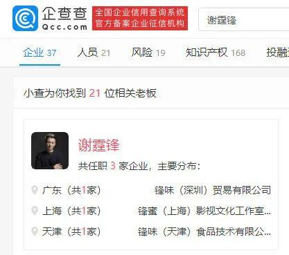 企查查显示,歌手、演员谢霆锋目前共涉及3家公司,分别为锋蜜(上海)影视文化工作室(有限合伙)、锋味(深圳)贸易有限公司、锋味(天津)食品技术有限公司。