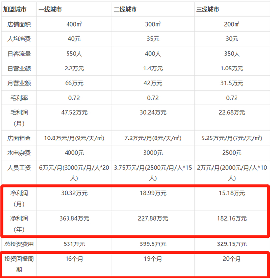 在肯德基官网上有一份这样的数据,像省会城市下面的3线城市,预估会在20个月之后开始回本。