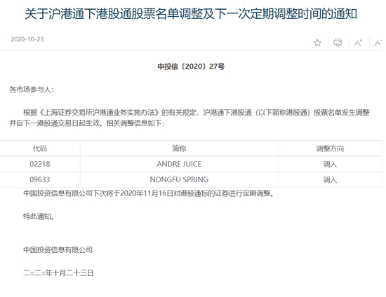 上交所:将农夫山泉、安德利果汁调入港股通 27日生效 新浪港股 新浪港股官方账号 2020.10.2317:06 关注 港股k线 根据上交所公告,将农夫山泉、安德利果汁调入沪港通下港股通股票名单,10月27日生效。