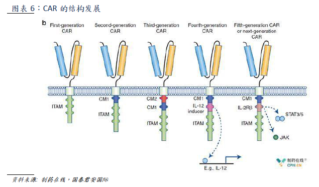 CAR-T的主要结构CAR设计分为三个部分,一是识别TAA的单链可变区scFv,二是跨膜结构TM,三是细胞内结构域。从CAR结构的改变可以分为五代。第一代CAR直接将抗原结合域直接与TCR恒定链CD3ζ融合,通过CD3ζ来启动激活级联反应。第二代CAR将T细胞共激域CD28或4-1BB融合到CAR的细胞内片段,改善T细胞的激活、增殖、存活。第三代CAR在第二代的基础上再加入一个T细胞共激域4-1BB,改善CAR-T细胞的长期持久性,促进CD8+ T细胞记忆。第四代CAR在第二代的基础上引入了一个共表达的细胞因子,比如IL-12等,能够触发原本由细胞因子诱导的信号,进一步加强T细胞应答。第五代CAR同样基于第二代,添加了激活其它信号通路的共刺激结构域,如IL-2Rβ可以胞内结合SAAT3/5的结构域。