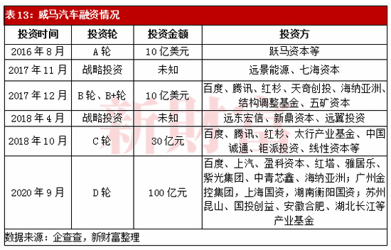2020年9月,威马汽车完成总额100亿元D轮融资,上海国资及上汽集团联合领投,百度与海纳亚洲继续参与投资,多家地方政府产业基金和国资平台,以及红塔集团、雅居乐、盈科等产业资本悉数入局。百亿元是造车新势力IPO前单轮融资之最,也是威马上市前最后一次融资。