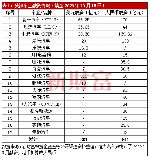 除去未透露金额的融资轮,17家车企从创业开始到IPO后,迄今总融资约201亿美元以及841亿元人民币,折合人民币大约2100亿元(表1)。
